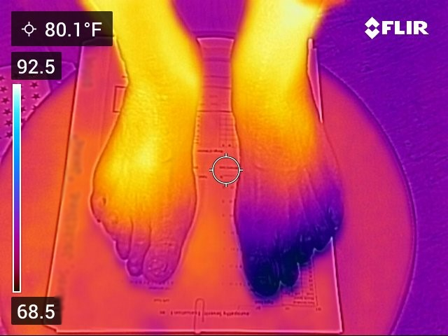 Our FLIRĀ® infrared camera captures a visual āheat mapā of your feet or hands, allowing our wellness team to spot asymmetries, cold zones, or hot spots that may suggest circulation issues, inflammation, or nerve damage.